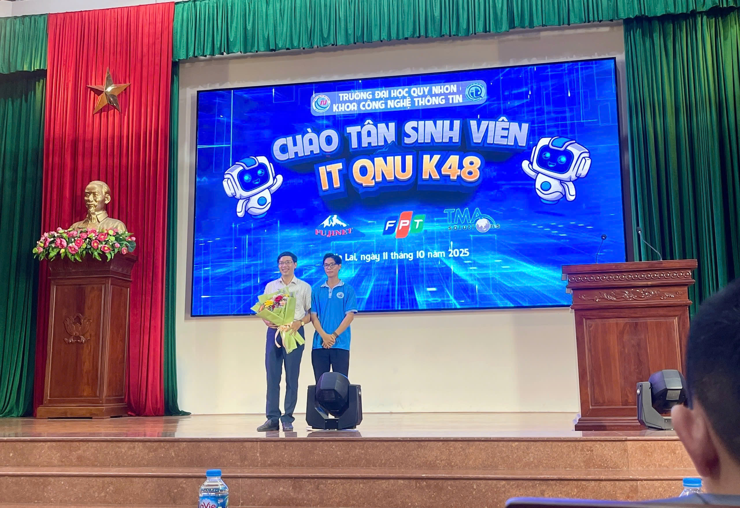 Về phía khách mời, chương trình vinh dự đón tiếp đại diện các doanh nghiệp đối tác gồm Công ty TMA Bình Định, FPT Software và Fujinet Quy Nhơn – những đơn vị luôn đồng hành cùng Khoa trong công tác đào tạo, thực tập và hỗ trợ sinh viên phát triển nghề nghiệp trong lĩnh vực công nghệ thông tin.